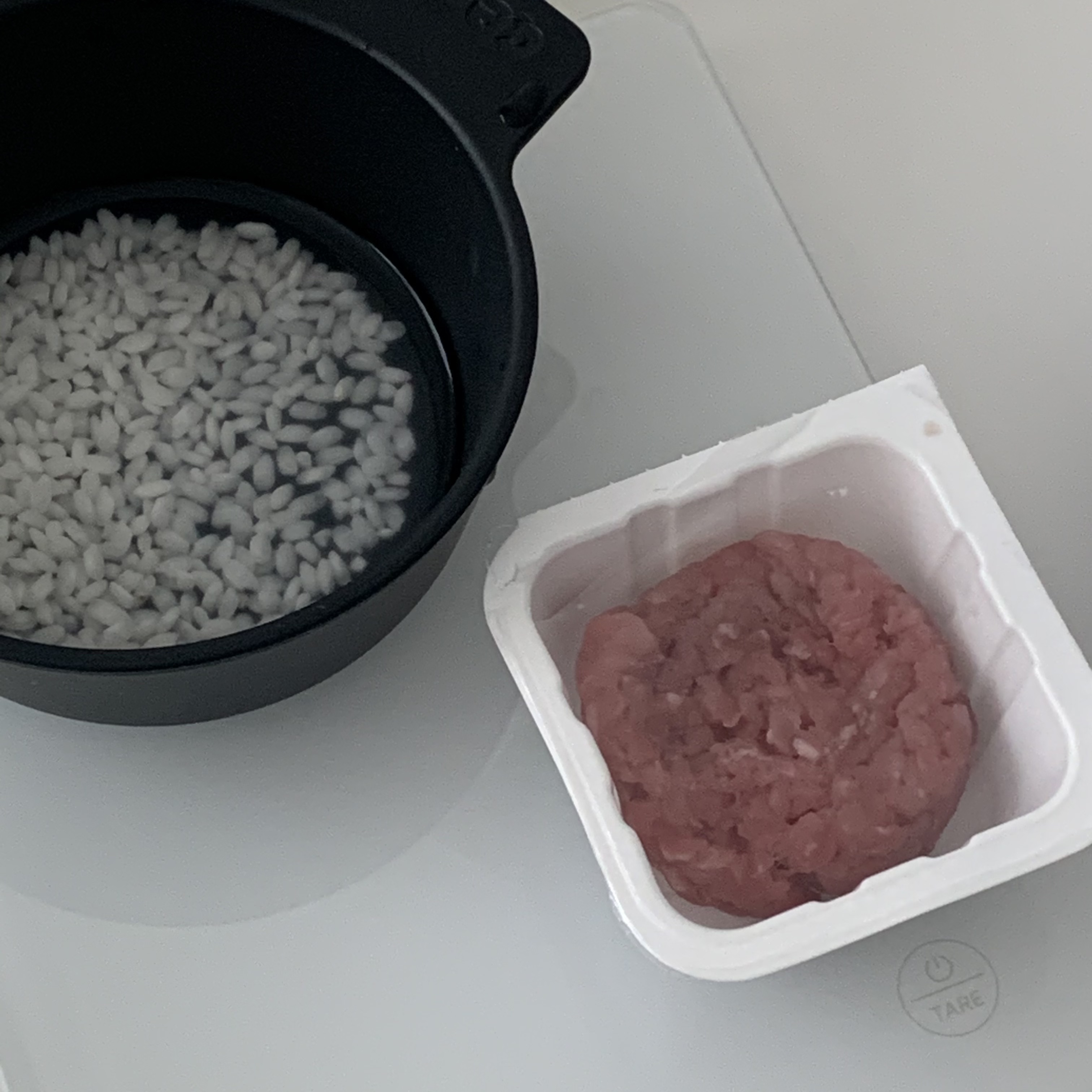 불린 쌀과 익은 소고기 다짐육을 함께